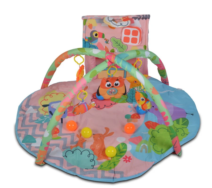 Het speelkleed heeft een speelboog met 5 afneembare speeltjes, zoals rammelaars. De speelboog is ook afneembaar.