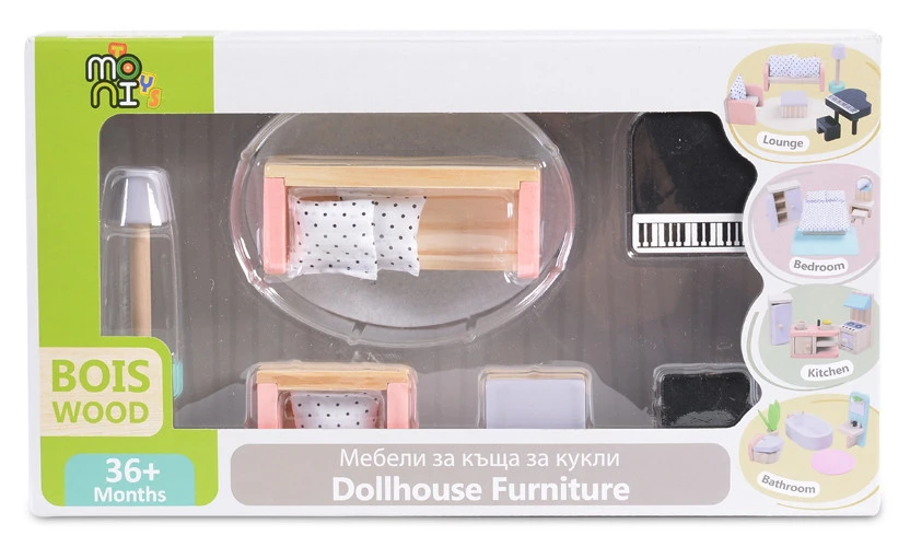 De set bestaat uit een complete woonkamer met bank, stoel, lamp, vloerkleed, tafel en piano met stoel. De set is gemaakt van hout en is geschikt voor kindjes vanaf 3 jaar. Uren speelplezier gegarandeerd!