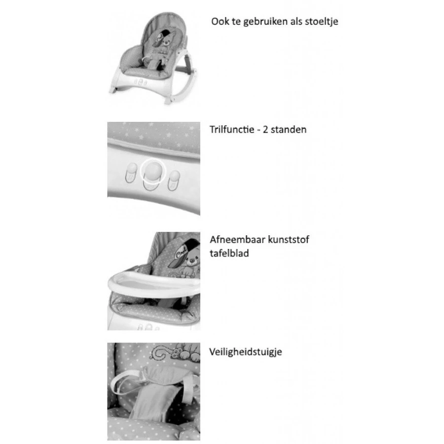 In deze wipstoel van Lorelli kan je kleintje heerlijk tot rust komen. Laat je kindje nog meer relaxen door de schommelstand (tevens vast te zetten) of vibratiemodus (2 snelheden) aan te zetten. Ook heeft het stoeltje een muziekfunctie, waarbij je kleintje kan luisteren naar 4 verschillende kalmerende muziekjes of vogelgeluiden. De wipstoel is voorzien van een veiligheidsgordel om de veiligheid van je kindje te garanderen.